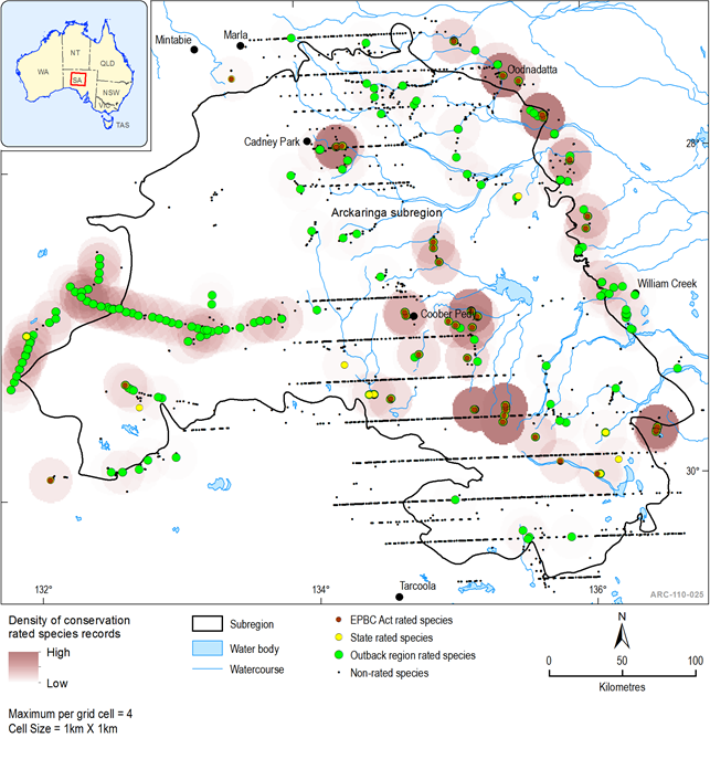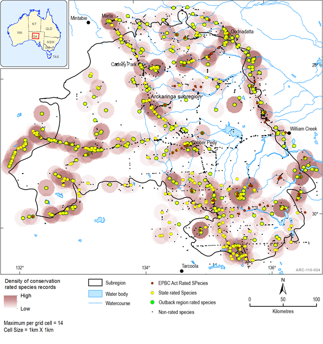 Within the Arckaringa subregion, approximately 1500 taxa from 90 vascular plant families have been recorded. Of these, 225 taxa have a National (EPBC ‑ 2 taxa), State (SANPWS ‑ 64 taxa) or Regional (Outback NRM Region ‑ 194 taxa) conservation status rating (Table 16). Figure 39 shows the distribution of rated species records within each rating category and the density of rated species records within 1 km2 grid cells. The highest density of rated species records (179 records) occur within a triangular area bounded by Cadney Park, Oodnadatta and Coober Pedy.