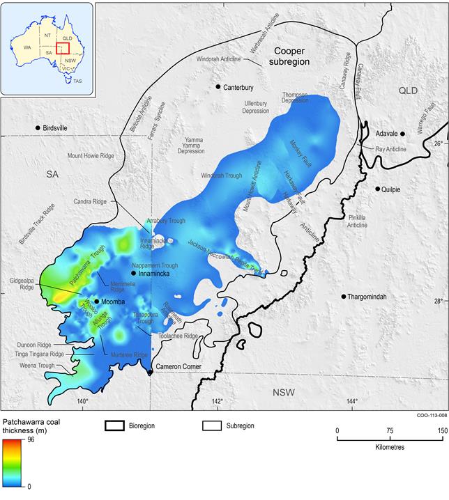 Patchawarra coal seams average 2.1 m thick but can be 22 to 30 m, with 30% of seams exceeding 2 m thick (Alexander et al., 1998). The thickest laterally extensive coal seam in the Patchawarra Formation is known as the VC50 coal. It ranges in thickness from 13 to 23 m, and is thickest in the Nappamerri and Patchawarra troughs (Figure 21), with coal thickness in the Weena Trough also significant (Simon, 2000). Recent drilling in the Weena Trough has encountered cumulative coal thicknesses of up to 145 m, with the thickest individual seam being 35 m (Strike Energy Limited, 2014). Drilling in the Windorah Trough in Queensland encountered cumulative thicknesses of coal in the Patchawarra Formation of 15 to 20 m (Real Energy Corporation Limited, 2014). The Patchawarra Formation is sufficiently mature to generate gas from coal seams over much of the basin, and high gas readings are recorded when mature Patchawarra Formation coals are intersected in wells (Deighton et al., 2003). Given that depths to the coal-bearing Patchawarra Formation exceeds 1000 m across the subregion, there is no potential for coal to be mined in the subregion (Menpes et al., 2012).