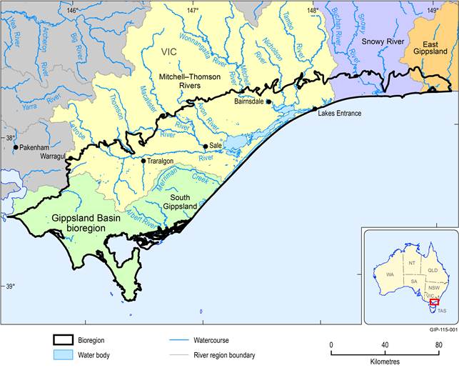 The Mitchell–Thomson River Region covers the central part of Gippsland Basin bioregion. It has a combined drainage area of 21,091 km2. Several large rivers including the Latrobe, Thomson, Mitchell, Tambo and Nicholson rivers are part of this river region. The surface water systems also include several creeks and wetlands (Figure 36). In the north, the river region is characterised by the naturally forested Eastern Highlands. The lower part of the river region features cleared agricultural land and flow to Gippsland Lakes in the east. The Latrobe, Thomson, Macalister, Avon, Mitchell, Nicholson and Tambo rivers all flow into the Gippsland Lakes through a varied landscape which includes open-cut coal mines, power generation plants, timber harvesting and paper production, major water storages, Ramsar wetlands and agricultural pursuits including irrigation, horticulture and grazing. Although much of the land has been cleared for agriculture, there are significant mining activities for brown coal used at Loy Yang, Hazelwood and Yallourn power stations. About 36% of the river region area is included in the Gippsland Basin bioregion and this makes up 52% of the bioregion area.
