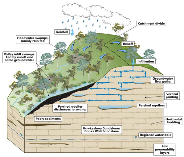 The peat swamps on the sandstone rocks of the Blue Mountains (western area of the basin) form in gently sloping headwater valleys, broad valley floors and alluvial flats, gully heads and open depressions on ridgetops (Commonwealth of Australia, 2014). Water flows through the swamps as sheet flow through the peat sediments, whereas groundwater can discharge to these swamps along fractures, joints or bedding planes intersecting the peat swamp. Usually, these swamps are associated with local groundwater flow systems of short path and residence time. The connection between these swamps and groundwater relies on perched aquifer conditions and thus is likely to be ephemeral (Commonwealth of Australia, 2014).