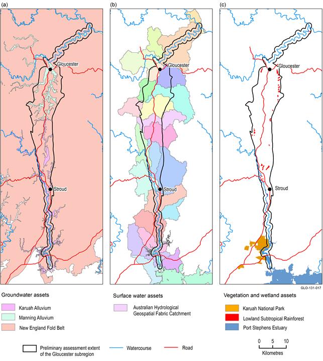 The total number of ecological assets in the preliminary assessment extent (PAE) of the Gloucester subregion is 116 (made up from 3400 elements). They fall within five of the ten ecological asset classes (Table 10): ‘River or stream reach, tributary, anabranch or bend’, ‘Wetland, wetland complex or swamp’, ‘Aquifer, geological feature, alluvium or stratum’, ‘Groundwater‑dependent ecosystems’ and ‘Habitat (potential species distribution)’. As described in the companion submethodology M02 (as listed in Table 1) for identifying water‑dependent assets (Mount et al., 2014), an asset may be made up of one or many polygons termed ‘elements’, and the number of elements for each asset is indicated in the following tables.
