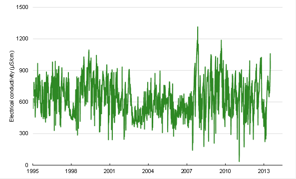 At Denman (Figure 14), salinity levels have not exceeded 1200 µS/cm at any time during the period of record. Between 1995 and 2000, they averaged around 540 µS/cm. The period between 2000 and 2006 was characterised by on average lower salinity (465 µS/cm), and was followed by an increase in salinity from about 2007 to levels that are on average higher (621 µS/cm) than during the earlier periods of record.