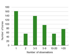 Figure 17 shows the frequency distribution of observations per bore. More than 25% of the bores (162) have only one measurement, while a further 55 bores have only two measurements. The median number of observations at a single point is 3. This dataset is used to constrain the parameters of groundwater model uncertainty analysis, however, given the poor quality of the dataset, it may not provide much constraint (see companion product 2.6.2 for the Hunter subregion (Herron et al., 2018)).