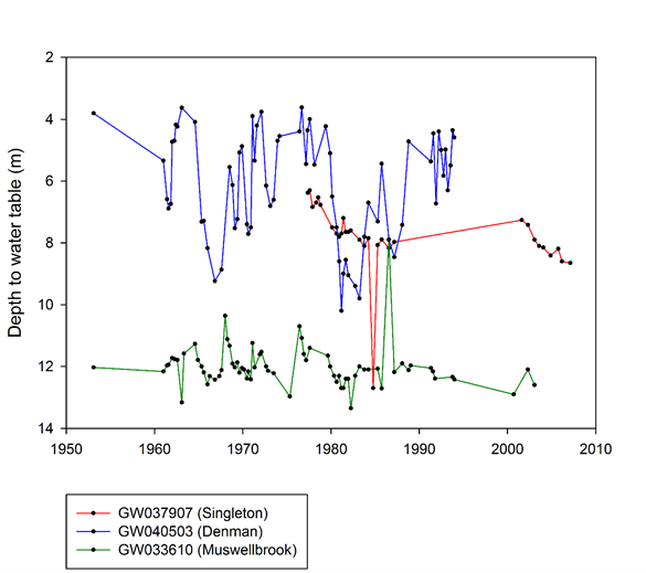Figure 18 shows time series of depth to watertable at these locations which, in spite of the relative lack of recent measurements, suggest a consistent pattern of varying depth to watertable along the Hunter River valley, with deeper groundwater levels at Muswellbrook (around 12 m depth), shallowing around Denman to between 4 and 5 m depth, and then deepening again around Singleton (around 8 m depth).