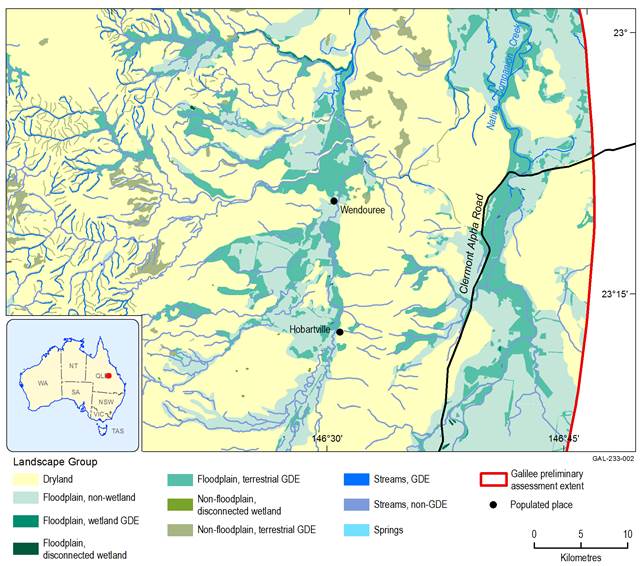 The landscape classification developed in this product provides a mechanism by which receptor impact modelling (product 2.7) can be undertaken on a large (>4000) number of assets. The rationale for this process is that a landscape class represents a water-dependent ecosystem that has a characteristic hydrological regime. As part of the landscape classification process in this product, the landscape classes are classified into landscape groups. Landscape groups are sets of landscape classes that share hydrological properties. Subsequent in the BA process, the landscape groups are amalgamated into larger entities to enable receptor impact modelling (product 2.7) to take place. There is no direct interaction between landscape classes and hydrological modelling, either groundwater or surface water, in the BA context. Not all of the landscape classes defined in this product will be affected by the coal resource development pathway in the Galilee subregion (refer to Section 2.3.4).