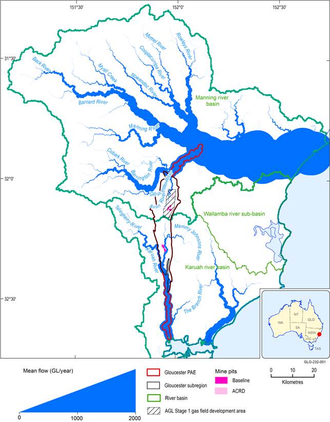 Data: PAE: Bioregional Assessment Programme (Dataset 1); surface water boundaries: Bioregional Assessment Programme (Dataset 2); mine pits: Bioregional Assessment Programme Data (Dataset 3; Dataset 4; Dataset 5) and AGL Stage 1 gas field development area: AGL Energy Ltd. (Dataset 6); flow volume: Bioregional Assessment Programme (Dataset 7)