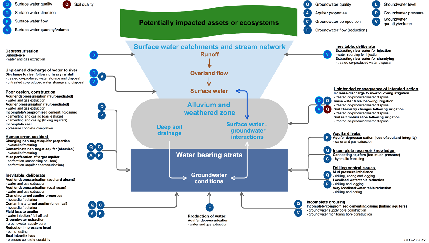 Hydrological effects associated with CSG operations that are considered to be in scope in the Gloucester subregion are shown in Figure 15 and listed below:
