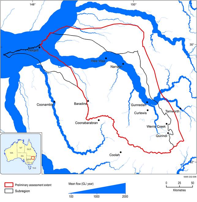 The subregion is bounded by the surface water catchment boundaries of the Namoi River along the northern and southern boundaries, and to the east by the Hunter-Mooki Thrust Fault System, which cuts across the Namoi river basin. The long-term surface water inflow at the eastern subregion boundary depends on the yearly dam water release from Keepit Dam and flow in the Peel River. The mean annual flow in the Peel River at Carroll Gap is 248.7 GL (53.3 mm runoff) for 1923 to 2015, while the mean annual release from the Keepit Dam is 215.8 GL (1996 to 2015) (NSW DPI, n.d.a). The sum of flows through these gauges provides an estimate of the surface water inflow to the subregion. The average annual outflow from the subregion, measured at Walgett, is 645.2 GL (1999 to 2014) (NSW DPI, n.d.b).