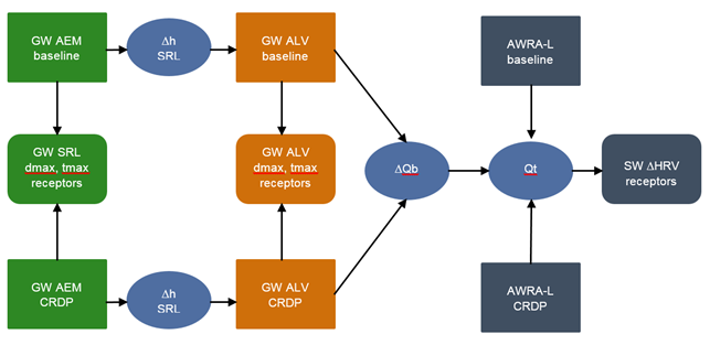 For this Assessment, a pragmatic coupling of three models was developed. The models consist of a regional groundwater model and an alluvial groundwater model to simulate the impact on the groundwater systems, and a rainfall-runoff model to simulate the impact on the surface water systems of the subregion. The individual models have different spatial and temporal resolutions which requires a set of customised processing steps to upscale or downscale model data to allow the models to be linked.