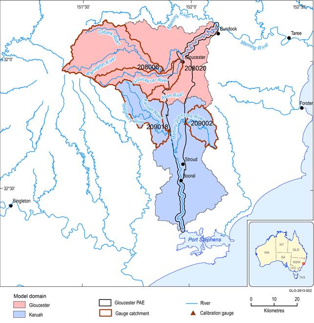 The Gloucester subregion contains two distinct river systems. The Gloucester river basin drains the northern half of the Gloucester subregion and discharges into the Manning River near Bundook. The Karuah river basin drains the southern half of the Gloucester subregion and discharges into Port Stephens (Figure 4). The surface water modelling domain adopted in the bioregional assessment includes the entire basin of the Gloucester River above its junction with the Manning River and the entire basin of the Karuah River above Karuah.