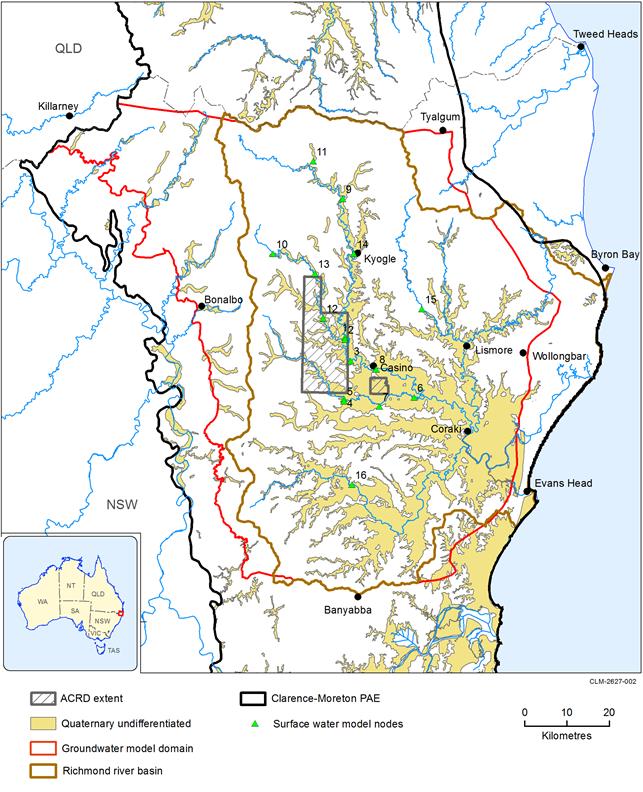 The difference in exchange flux between aquifers and surface water features due to the additional coal resource development was reported at 16 surface water model nodes located within the groundwater model domain (Figure 27). The results, which reflect a change in river baseflow, were fed back into the Australia Water Resources Assessment (AWRA) landscape model (AWRA‑L) to predict changes in total streamflow and other flow indices due to the additional coal resource development. The change due to the additional coal resource development on hydrological response variables associated with surface water is reported in companion product 2.6.1 for the Clarence‑Moreton bioregion (Gilfedder et al., 2016). The baseflow change was reported as aggregated flow rate variation over all the cells above a surface water model node. For example, the baseflow change at CLM_014 is a sum of the change at all cells that interact with rivers above CLM_014 (Figure 27).