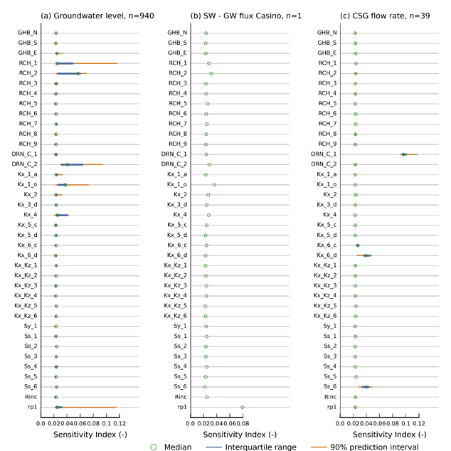Figure 30a shows boxplots of the sensitivity indices for all simulated equivalents to the available groundwater level observations. The plot shows that a large number of groundwater level predictions are sensitive to the same set of parameters as identified to be sensitive for groundwater level prediction at observation bore CLM_oh6.