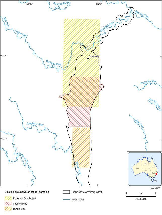 Three existing groundwater models have been identified that cover various parts of the Gloucester preliminary assessment extent (PAE). They are the Duralie Coal Mine model (developed using Groundwater Vistas software), the Stratford Mining Complex model (developed using Groundwater Vistas software) and the Rocky Hill Coal Project model (developed using the MODHMS modelling package). The Duralie Coal Mine model covers the south part of the Gloucester PAE, while the other two models cover the north parts of the Gloucester PAE. All three models were aimed at quantifying the impact of open-cut coal mines on groundwater systems, which also included a few water supply bores that are currently in use, and groundwater levels in alluvial aquifers.