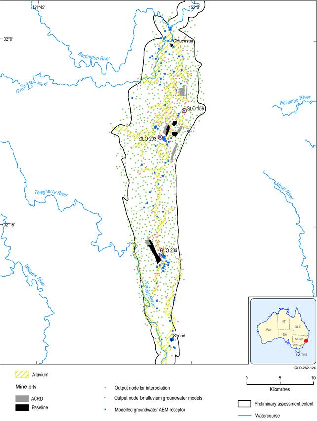 The GW AEM also provides the time series of change in the lower boundary condition for the Avon and Karuah alluvial MODFLOW models. As drawdowns vary smoothly in space and time and to avoid the numerical burden of computing drawdown time series at every 90 m grid cell with a monthly time step, outputs were generated only for the surface weathered and fractured rock layer at a selection of 108 points (Figure 19) every ten years of simulation between 0 and 100 years. This selection of output locations and times is the result of a trial-and-error procedure to ensure information loss is minimal. The spatial density of points was controlled by the position of the Avon River and Karuah River alluvium model grid and the proposed coal seam gas (CSG) development area. For communication with the alluvial groundwater models, this model output was resampled and interpolated to the desired spatial and temporal resolution.