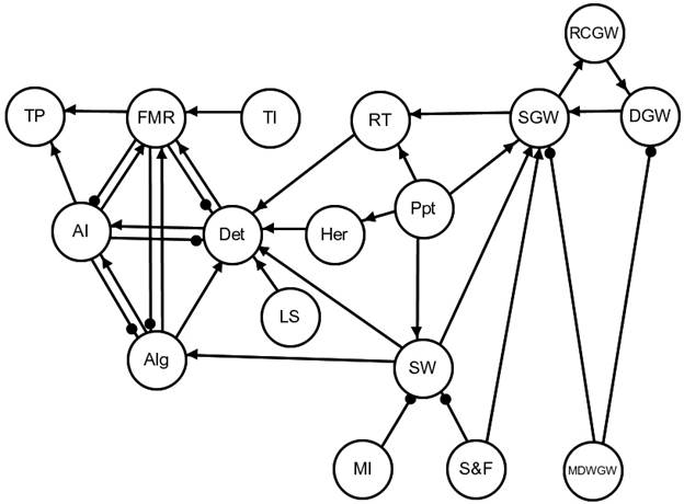 Model variables are: aquatic invertebrates (AI), algae (Alg), detritus within stream channel (Det), deep groundwater (confined aquifers) (DGW), fishes (migrant and refugial populations) (FMR), herbs (Her), lateral stores of detritus (LS), mine dewatering of ground water (MDWGW), mine interception (MI), precipitation (Ppt), recharge of confined groundwater (RCGW), riparian trees (RT), subsidence and fracturing from mining (S&F), shallow groundwater (SGW), surface water (SW), terrestrial invertebrates (TI), terrestrial predators (TP).