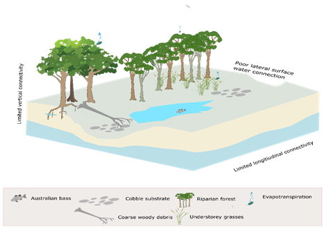 During periods of zero flow and low flow (Figure 12 and Figure 13), lateral connectivity is likely to be limited; however, low flows are important for maintaining vertical connectivity to the hyporheic zones of the streambeds (Ward, 1989; Kondolf et al., 2006), and for maintaining longitudinal connectivity within the landscape by linking instream habitats and allowing dispersal of instream biota (Dollar, 2000; Robson et al., 2009; Marsh et al., 2012; Boulton et al., 2014). Low flows (Figure 13) provide seasonal habitat for many species and can maintain refugia for other species during droughts (Dollar, 2000). In regions with seasonal rainfall, low flows are maintained by baseflow, which is generally considered to be a groundwater contribution to the hydrograph, hence the importance of the vertical connection of the riverbed to groundwater. In a synthesis of case studies, Marsh et al. (2012) concluded that increasing durations of low flow are correlated with declining water quality (increased temperature and salinity and reduced dissolved oxygen), and that this a primary driver of ecological responses of most aquatic biota, especially in pools. Riffle habitats are not only affected by changes in water quality but also by reduced habitat area, as riffles dry out and contract.