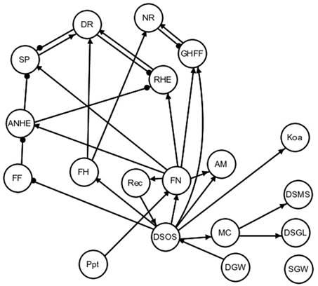 A model for dry sclerophyll forests was developed based on the model structure of wet sclerophyll forests. All features of this model were the same as for wet sclerophyll forests, but with added uncertainty in the role of microclimate (MC) in supporting understorey vegetation components. This uncertainty was whether the microclimate created by the dry sclerophyll forest overstorey (DSOS) was beneficial to mid-storey (DSMS) and ground-layer (DSGL) vegetation, which led to two alternative models, one with (model 1 in Figure 27) and one without (model 2 in Figure 28) positive links from microclimate to mid-storey and ground-layer vegetation. There was also uncertainty between two experts as to whether or not dry sclerophyll trees could effectively access stores of deep groundwater (DGW) outside of alluvial deposits, which involves the positive link from deep groundwater to the dry sclerophyll overstorey variable. Omitting this link would essentially mean that the system was not a groundwater-dependent ecosystem. It would also remove any possible impact from coal mining on groundwater stores. This uncertainty in model structure was therefore not propagated through the qualitative analysis of perturbation response.