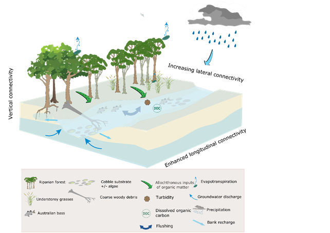 Ecologically important components of the hydrograph can be broadly summarised (Dollar, 2000; Robson et al., 2009) as cease-to-flow periods, periods of low flow, freshes, and periods of high flow (including overbench and overbank flows) as illustrated in Figure 6. Longitudinal, lateral and vertical connectivity are enhanced with increasing flow. Increasing flow increases connectivity between habitats and enables greater movement of aquatic biota, water-borne nutrients, and fine and coarse particulate organic matter. Flow regimes determine natural patterns of connectivity, which are essential to the persistence of many riverine populations and species (Bunn and Arthington, 2002). High flows are especially important for lateral connectivity and channel maintenance. Low flows are critical for maintaining vertical and longitudinal connectivity, and water quality of inundated habitat including pools. Freshes can trigger fish spawning, maintain water quality in inundated habitats and cleanse and scour the riverbed. A lack of vertical connection to groundwater can result in cease-to-flow periods during periods of little or no rainfall. Cease-to-flow events dry out shallow habitats and can create chains of pools, isolated pools or completely dry riverbeds, depending on riverbed morphology (Robson et al., 2009). The limited lateral, vertical and longitudinal connectivity associated with the zero-flow condition is illustrated in Figure 7, where an isolated pool persists between dry riffle beds and the groundwater level is below the channel bed.
