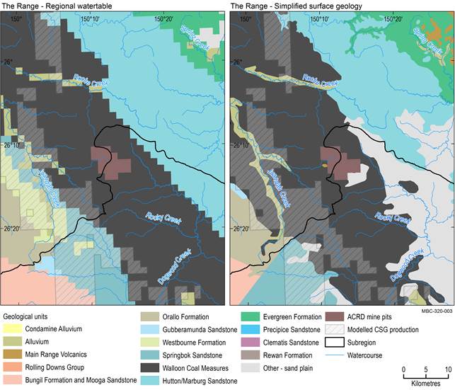 Impacts to water-dependent landscapes and assets are mostly caused by changes to groundwater in the regional watertable, which predominantly affect the ‘alluvium and watercourses in aquifer outcrop areas within and downstream of tenements’ system component identified in the conceptual model of causal pathways. The regional watertable represents the upper groundwater level within the near-surface aquifer, and may exist in different geological units or layers. Near the two additional coal resource developments it occurs in the alluvium, as well as the Main Range Volcanics and the Walloon Coal Measures. Springs and groundwater bores may be affected by hydrological changes in deeper geological layers, which may have repercussions for surface ecosystems surrounding springs.