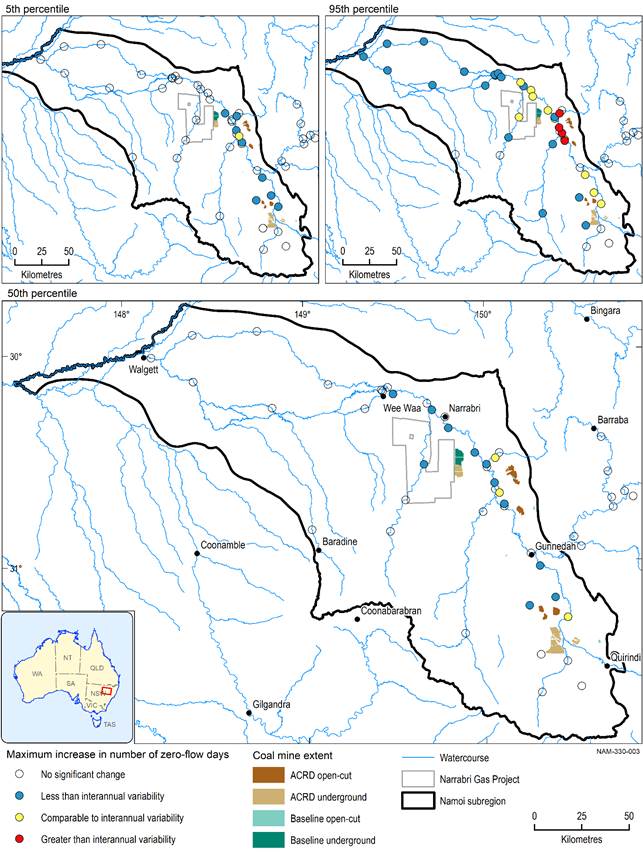 Five stream reaches are very likely to have an increase in zero-flow days of more than 20 days per year. They are: Back, Merrygowen and Bollol creeks, Mooki River at Breeza and Mooki River upstream of its confluence with the Namoi River. These streams drain Maules Creek, Boggabri expansion, Tarrawonga expansion and Watermark coal developments respectively (see Aryal et al. (2018)). Only Bollol Creek is very likely to have an increase in zero-flow days of more than 80 days. For Back, Merrygowen and Bollol creeks there is a 5% chance of an additional 200 or more zero-flow days. All of these creeks may not actually flow for 200 days. This apparent anomalous increase in zero-flow days occurs because in particularly wet years modelling indicates that the river can flow for more than 200 days per year as reflected in the 5% chance of that happening. As BAs report the maximum change in zero-flow days due to additional coal resource development, the reporting is biased towards a wet year when these maximum changes can occur.