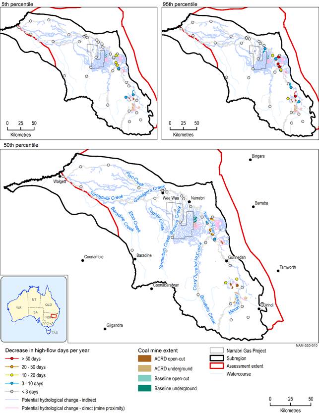Figure 20 shows the comparison of maximum change in high-flow days due to additional coal resource development and interannual variability in high-flow days under the baseline. At the 5th and 50th percentiles, all changes are either not significant or less than interannual variability. At the 95th percentile, there are four nodes which show reductions in high-flow days that are either similar to or greater than interannual variability. These four nodes, which drain catchments near Maules Creek, Boggabri expansion, Tarrawonga expansion and Watermark mine developments, could potentially experience reductions in high-flow days that take the high-flow regime outside the interannual variability previously seen under the baseline.
