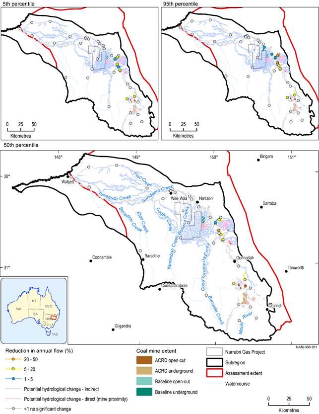 Reductions in annual flow are similar for all three percentiles. This is because reduction in annual flow is driven primarily by direct interception of surface runoff by open cut mines. The probability of this reduction does not vary. Only a small component of the reduction in annual flow is driven by changes in baseflow due to reduced surface water – groundwater connectivity.