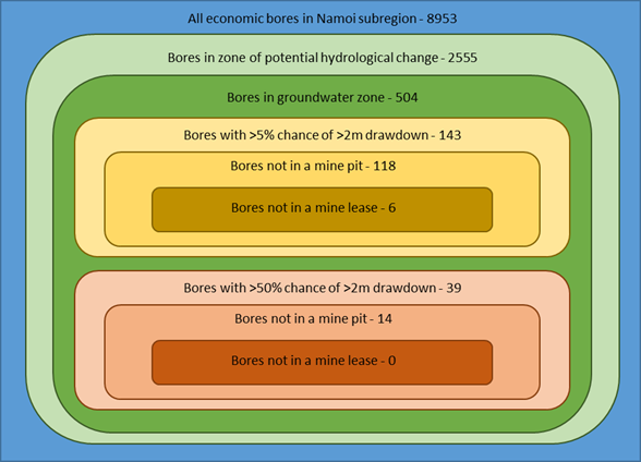 Of the 2555 bores identified as being within the zone of potential hydrological change there are only 504 within the groundwater zone of potential hydrological change and are therefore potentially impacted (excluding the 25 bores within the mine pit exclusion zone) (Table 41 and Table 42). It is very unlikely that the 2051 bores solely within the surface water zone of potential hydrological change will be impacted due to additional coal resource development.