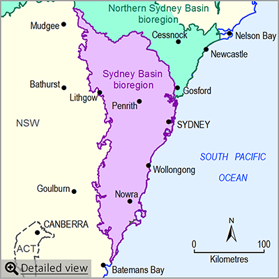 The Sydney Basin bioregion includes Australia’s largest city, Sydney, as well as the cities and towns of Wollongong, Bowral, Moss Vale, Nowra and Lithgow. It also includes significant parts of the Blue Mountains, Wollemi and Moreton national parks.